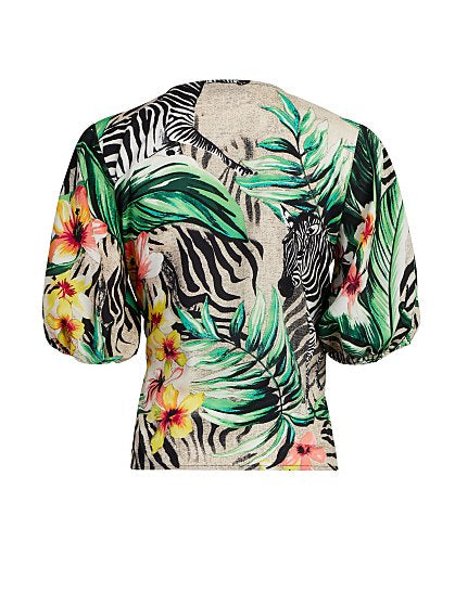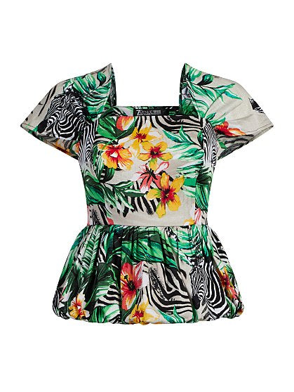 Tropical-Print Puff-Sleeve Cotton Shift Dress